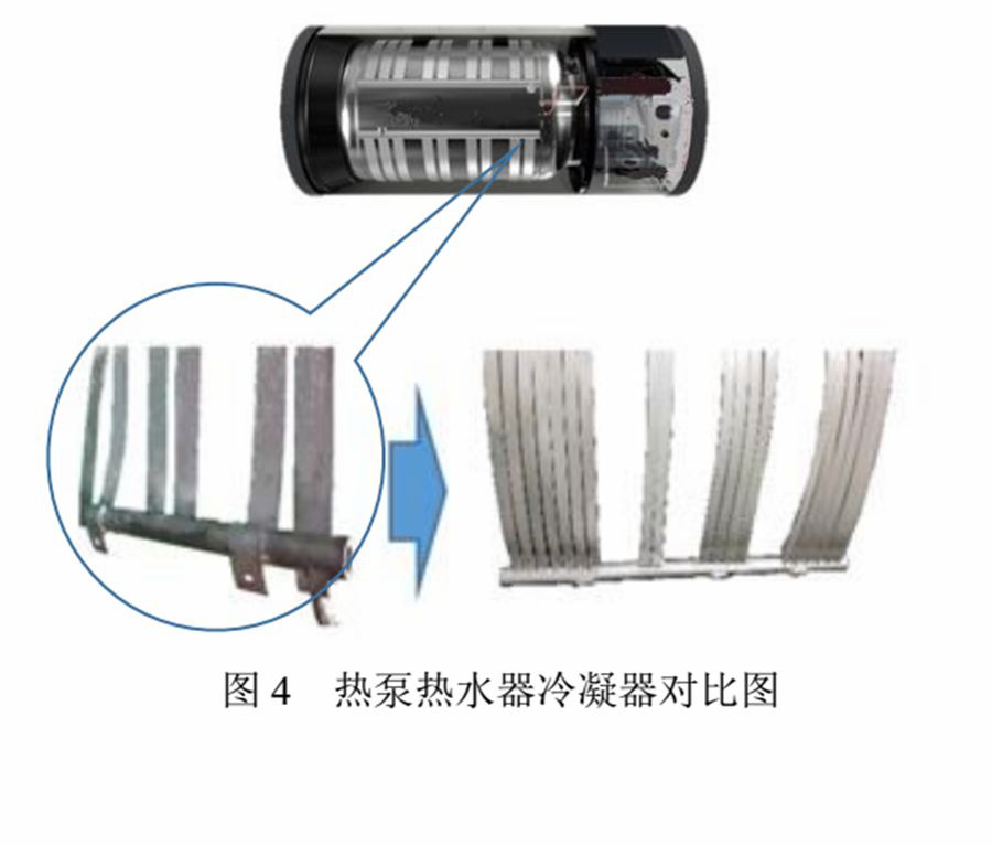 (2)对于热泵热水器冷凝器来说,在成本基本不变的情况下,采用16mm扁管代替原机25mm扁管冷凝器,扁管之间的间隔更小,与储水箱的贴合面积更大,可有效地提高整体能效0.3左右能效水平可提高1-2级,加热速度也略有加快。