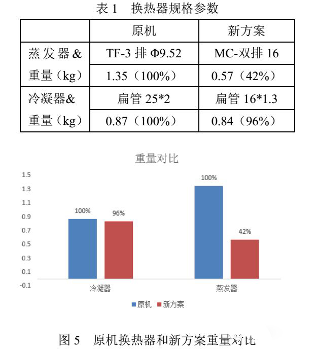 本文蒸发器如图3所示,采用微通道换热器代替原机铜管翅片换热器,可有效降低重量和成本,冷凝器如图4所示采用新型微通道扁管,优化与内胆外壁面的接触面积在成本持平的情况下,增加了约30%的热交换面积。表1和图5表示蒸发器和冷凝器的规格和重量对比。