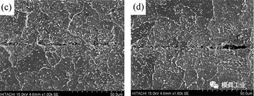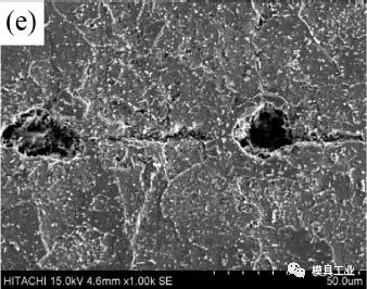 图5示出了使用SEM(HITACHI S3400)观察S136模具钢的真空扩散焊接试样的焊接组织的微观形态的结果。从图5(a)~(c)可知,S136组织中的碳化物分散分布在铁素体基体上,碳化物粒子细小均匀地分布,焊接品质良好,从图5(d)可知,在焊缝的个别区域形成间隙,间隙宽度约为5μm;由图5(e)可知,在焊缝个别区域出现的孔的孔长为10~20μm,宽度5~10μm。从总体分析来看,焊接质量好,但也存在一定的缺陷。原因如下:①随形冷却水线塞焊接表面粗糙度大,②焊接压力不足,③保温时间短。增加焊接压力会增加焊接件的变形风险,延长保温时间会使晶粒长大,影响焊接件的适用性,因此在实际加工过程中,一般采用降低镶件表面粗糙度的方法来提高焊接件的焊接质量。